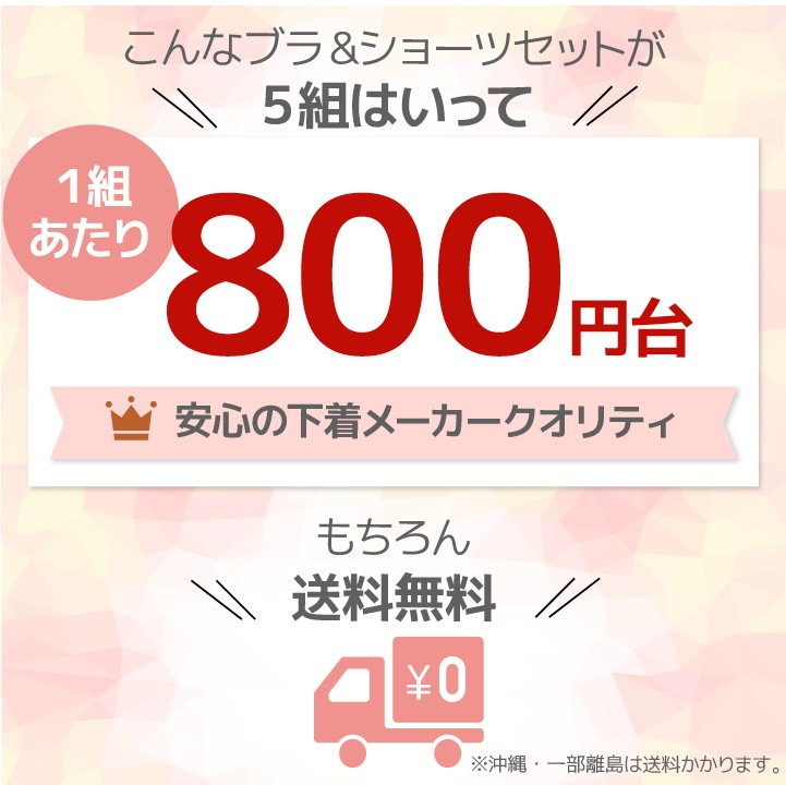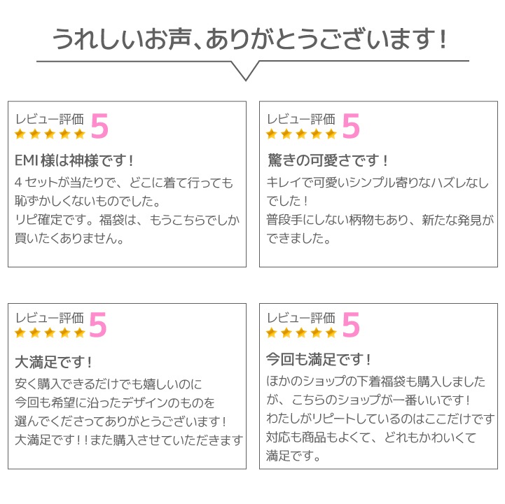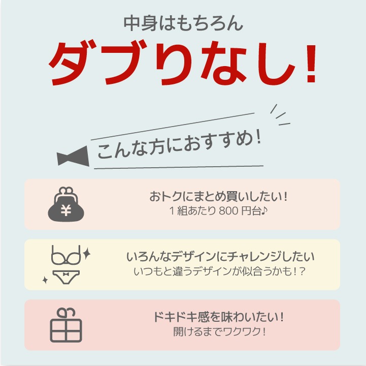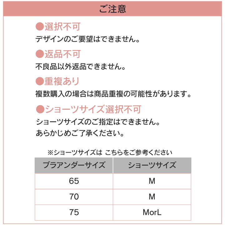 | 注意事項 | ・【選択不可】 デザインのご要望にはお応えできかねます。 タグがついていない商品も含まれる場合がございます。 ・【重複の可能性あり】 複数セットご購入頂いた際に、商品が重複する可能性があります。 ・【ショーツサイズ選択不可】 ショーツのサイズのご指定は出来ません。 ・【送料】 北海道は送料440円、沖縄・離島は送料660円かかります |