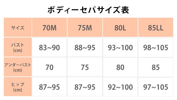 70M(バストサイズ83cm-90cm アンダーサイズ70cm ヒップサイズ87cm-95cm) 75M(バストサイズ88cm-95cm アンダーサイズ75cm ヒップサイズ87cm-95cm) 80L(バストサイズ93cm-100cm アンダーサイズ80cm ヒップサイズ92cm-100cm) 85LL(バストサイズ98cm-105cm アンダーサイズ85cm ヒップサイズ97cm-105cm) |