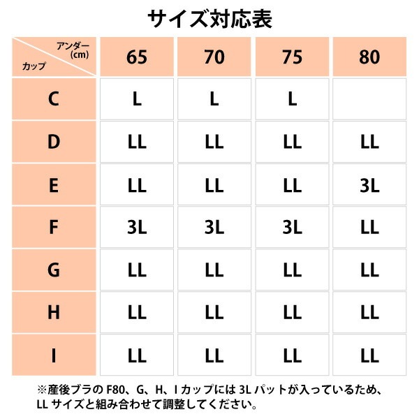 | サイズ | Lサイズ LLサイズ 3Lサイズ ※産後ブラのF80、GHIカップには3Lパッドが入っているため、LLサイズと組み合わせて調整してください。 |