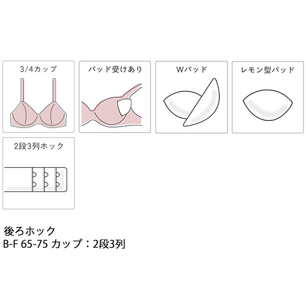 | サイズ | 【ブラジャー】 B65、B70、B75 C65、C70、C75 D65、D70、D75 E65、E70、E75 F65、F70、F75 【ショーツ】 M(ヒップ87-95cm) L(ヒップ92-100cm) ※D75、E75、F75サイズはセットショーツがLサイズとなります |