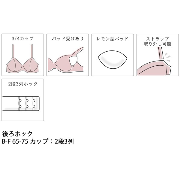| サイズ | 【ブラジャー】 B65、B70、B75 C65、C70、C75 D65、D70、D75 E65、E70、E75 F65、F70、F75 【ショーツ】 M(ヒップ87-95cm) L(ヒップ92-100cm) ※D75、E75、F75サイズはセットショーツがLサイズとなります |