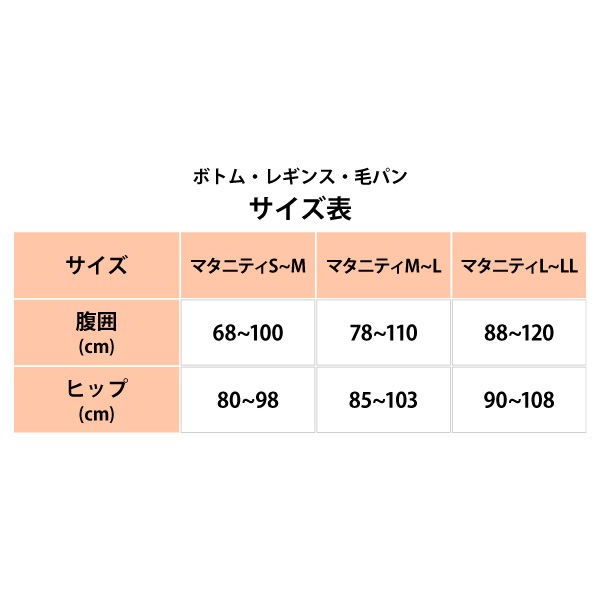 マタニティM-L(腹囲78-110cm、ヒップ85-103cm) ※出来上がり寸法を表示しております。 ※サイズ詳細の寸法には多少の差異がございます。 |