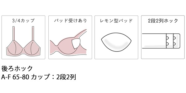 手洗いのみ ※お洗濯は、必ず「取り扱い表示」にしたがってください。 ホック:後ろホック2段2列 パッド:あり パッド受け:あり (A~D)65~75サイズ:ぷっくりパッド (C・D)80サイズ、(E・F):ピタッとパッド ・まるみのあるシルエットで、きれいな谷間をメイクしてキープ ・キレイな谷間をメイクするキープリボン構造はそのままに、若い世代の体型特徴を考えた設計仕様を採用 ・動いてもカップがパカパカしにくい ・底面積広めのバージスライン(バストの底辺)に合わせやすいワイヤー ・カップはまるみのあるシルエット+サイズに合わせたバストメイク A-D 65-75サイズ:ぷっくりパッド付きでしっかりボリューム C-D 80サイズ、E-Fカップ:すっきりととのえる ※C-D 80サイズ、E-Fカップは、パッドを取りはずした状態でのボリューム設定 【別売りのコーディネートアイテム】 ・3/4カップブラジャー:BRB409 ・ハイレッグショーツ:PRA109 |