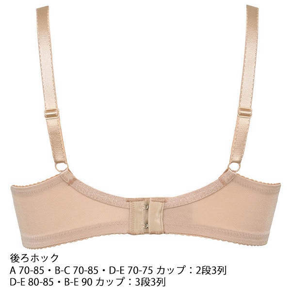 手洗い ※お洗濯は、必ず「取り扱い表示」にしたがってください。 ノンワイヤー ホック:後ろホック A-C 70-85、 D-E 70-75カップ:2段3列 D-E 80-85、 B-E 90カップ:3段3列 パッド受け:あり パッド:なし サイドボーン: ストラップ:付け替え不可、長さ調節可 ・カップ周囲のストレッチ素材が、バストをすっぽり包んで美しいシルエットにします。 ・アンダー部分はフルストレッチ構造で、しめつけ感が少なくラクなつけごこちです。 ・幅広ストラップを使用することで、くいこみにくく、肩にやさしいです。 ・カップ肌側とバックは綿混素材を使用し、やさしい肌ざわりです。 ・環境に配慮した再生糸混のレースを使用しています。 ※BRA134と同一商品で品番変更です ※商品やサイズによっては柄の位置やデザインが異なる場合があります |