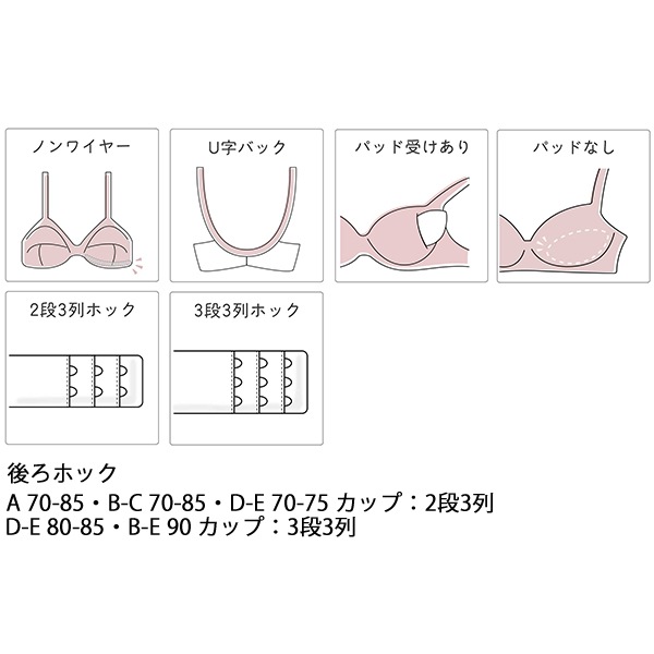 A70、A75、A80、A85 B70、B75、B80、B85、B90 C70、C75、C80、C85、C90 D70、D75、D80、D85、D90 E70、E75、E80、E85、E90 ※アンダー90サイズはQB、QC、QD、QEカップとなります |