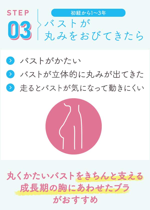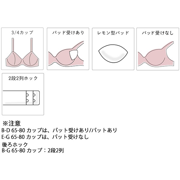 手洗い ※お洗濯は、必ず「取り扱い表示」にしたがってください 3/4カップ ホック:後ろホック2段2列 B-D 65-80カップ:パッド受けあり/パッドなし E-G 65-80カップ:パッド受けなし/パッドなし ストラップ:付け替え不可 ティーンのためのカップ別設計でなりたいバストにメイクできる 《AFTER STEP まるくボリュームがでてきた胸に自然にフィットしやすい》 ・B-Dカップはパッド入りカップでバストメイク ・E-Gカップはトップを突出させないコンパクト設計で、着やせシルエット(パッドなし) ・カップは広めのワイヤーとやわらかい素材で、成長期のバストをふんわり包んでやさしくサポート ・土台は伸びない素材、バックはほどよいサポート感のある素材でバストをしっかり支える ・カップ肌側は吸汗速乾性のよい綿混素材でさらっと快適 | ||||